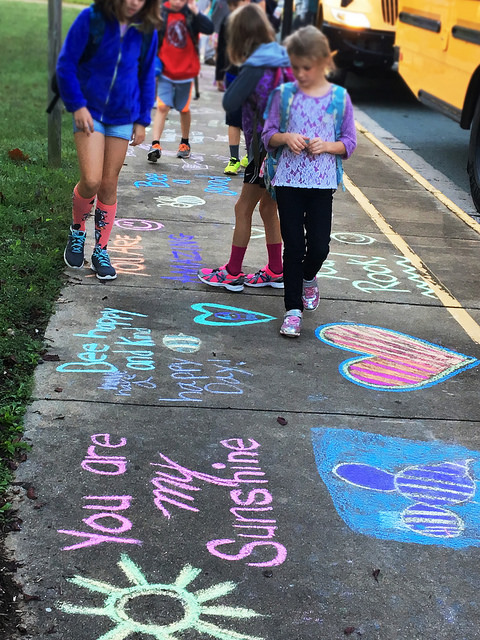 There is nothing more rewarding than seeing the faces of the kids light up as they get off the bus. I watched a 4th grade boy walk slowly down the sidewalk, reading aloud each positive message. That boy walked into the doors this morning with a smile on his face. Letting these kids know how loved they are and surrounding them with messages of encouragement was what this was all about. 🙂